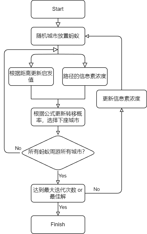 注意:如果 \(\alpha\) 过分大,启发值几乎不起作用,并且一开始所有路径信息素初值一致,该算法就相当于蚂蚁随机走动。如果 \(\beta\) 值(启发值重要程度)过分大,则蚂蚁的每次选择几乎根据路径长度决定,该算法就相当于贪心策略,很难搜索到全局最优解。通常我们将 \(\alpha\) 设置为 1 而将 \(\beta\) 设置成 6。